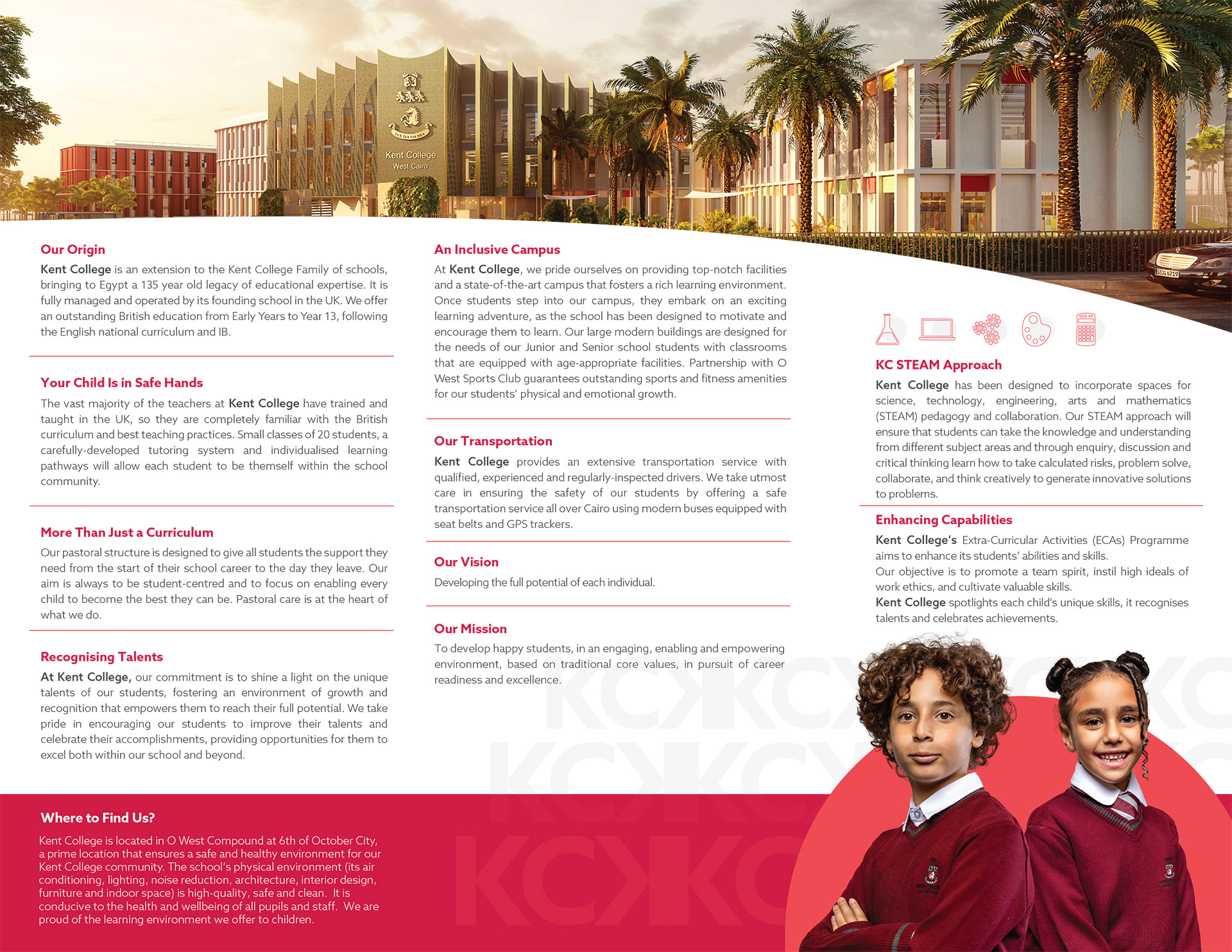 Kent College West Cairo is an International School in Cairo, Egypt. It is a prestigious educational institution, is managed and operated by its founding school in the UK, ensuring a strong connection to the British Curriculum. To maintain the highest standards and quality of education, Kent College West Cairo undergoes regular inspections by Kent College Canterbury, which includes visits for educational support, expertise, and ensuring the school's provision is of the utmost quality, both academically and pastorally.